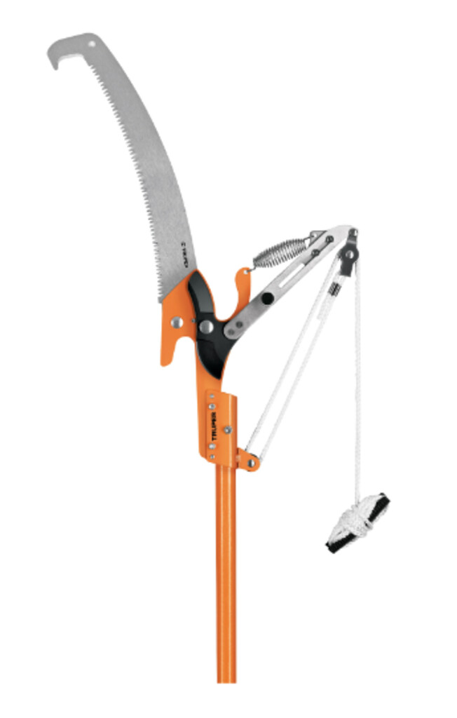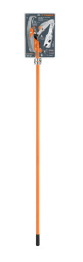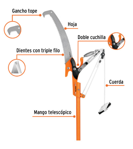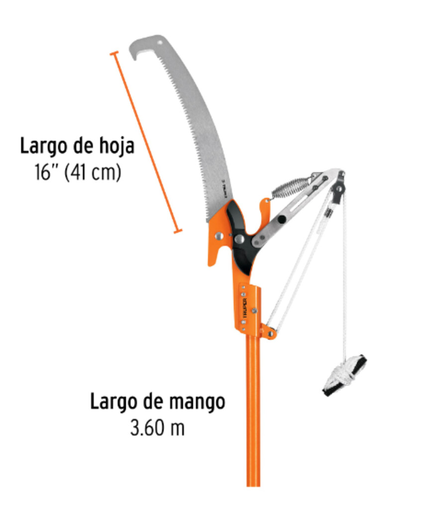 Cortador de ramas altas mango telescópico 3.6 m fibra vidrio • Hoja de acero SK5, templada para máxima duración de filo • Doble cuchilla de paso que corta hacia adelante y hacia atrás • Sistema de polea para reducir el esfuerzo al cortar • Mango telescópico de fibra de vidrio • Gancho tope para facilitar los cortes • Ideal para cortes altos y de difícil acceso