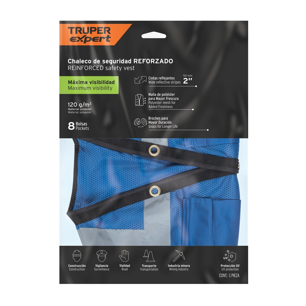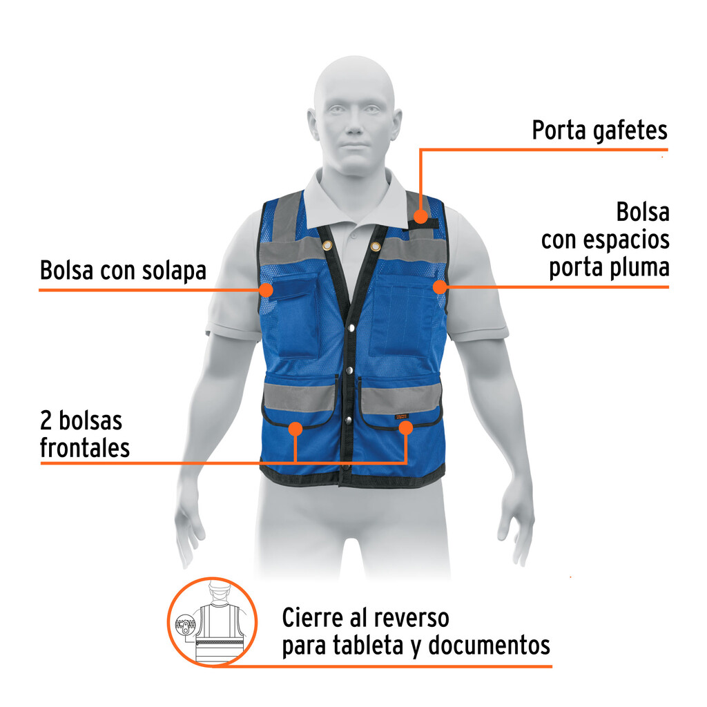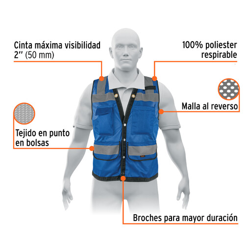 Chaleco Seguridad Reforzado Azul Con Bolsas, M, Expert
